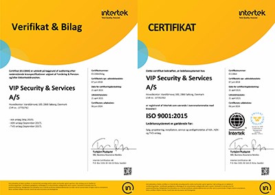 Firmaet VIP Security & Services A/S er ISO9001 godkendt samt certificeret indenfor alt elektronisk sikring som :